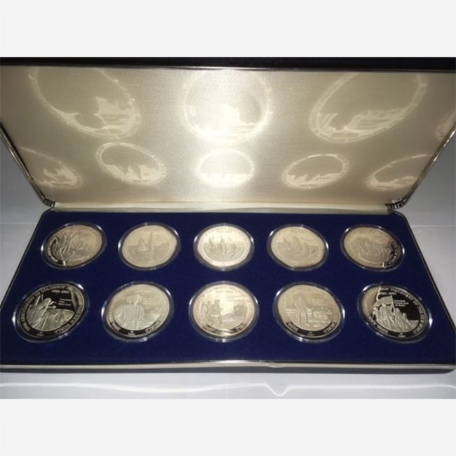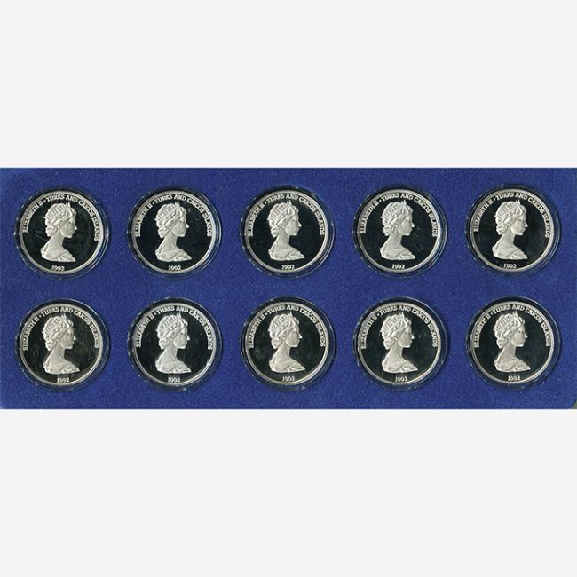 Emissione numismatica di una serie di 10 monete in argento .999% in versione fondo specchio (proof), emesse dal Turks & Caicos Island a riconoscimento di Cristoforo Colombo per la commemorazione del 500° anniversario della scoperta del Nuovo Mondo.