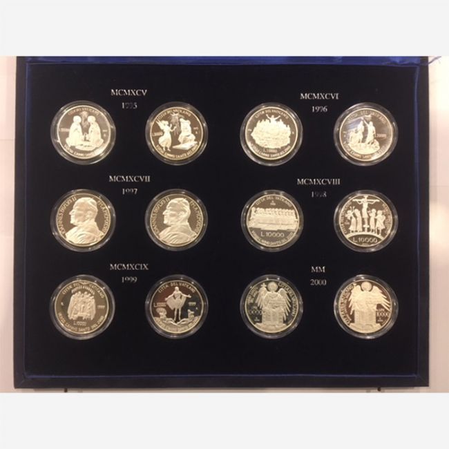 Città del Vaticano, emissione di 12 monete celebrative da 10.000 lire in argento 835% in fondo specchio (proof). Le monete inserite ognuna nelle proprie capsula sono riunite per l'evento nel cofanetto originale in velluto blu, per celebrare l'Anno Santo del 2000 sotto il pontificato di sua Santità Giovanni paolo II.