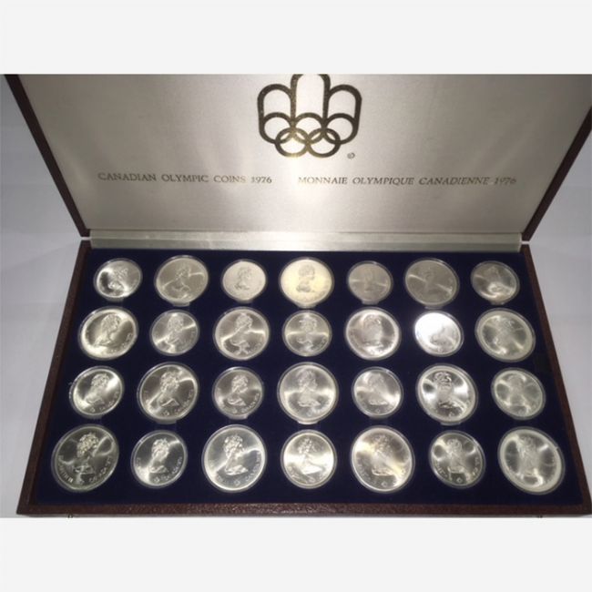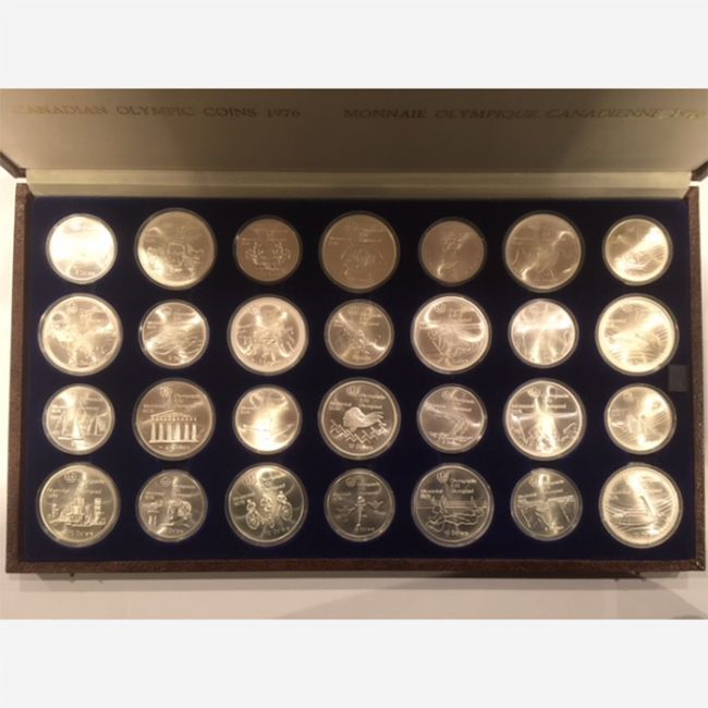 Canada, monete olimpiche canadesi per la celebrazione delle olimpiadi di Montreal del 1976. Il set è composto da 28 monete in argento 925%, di cui 14 da 5 dollari e 14 da 10 dollari. Ogni moneta da 5 dollari pesa 24,30 grammi mentre il 10 dollari pesa 48,60 grammi, tutte sono inserite nella propria capsula e collocate in un elegante cofanetto in legno emesso per l'evento.