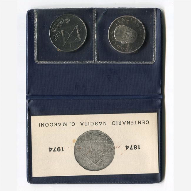 La moneta prova è confezionata in astuccio originale insieme ad un esemplare normale. Al dritto è raffigurata la testa di Guglielmo Marconi, al rovescio il ricevitore radio del 1926 e sotto la scritta GUGLIELMO MARCONI.