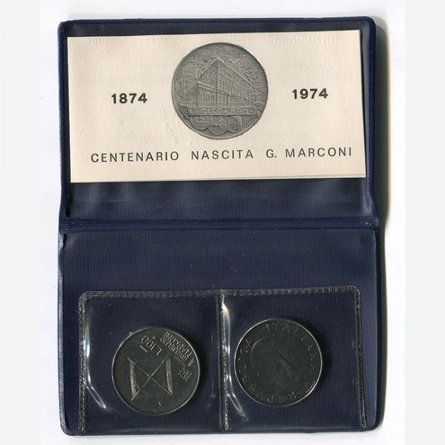 La moneta prova è confezionata in astuccio originale insieme ad un esemplare normale. Al dritto è raffigurata la testa di Guglielmo Marconi, al rovescio il ricevitore radio del 1926, la scritta PROVA è posta a destra sopra il valore L.100.