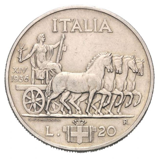 Moneta 20 Lire in Argento data 1936 di Vittorio Emanuele III detta "Impero". Nel dritto della moneta raffigurata la testa del Re e nel contorno la scritta VITTORIO EMANUELE III RE E IMPERATORE, nel rovescio della moneta raffigurata l'Italia con Vittoriola e fascio seduta su quadriga lenta a destra, in basso stemma sabaudo coronato con fasci ai lati. Contorno della moneta rigato. Zecca di Roma.