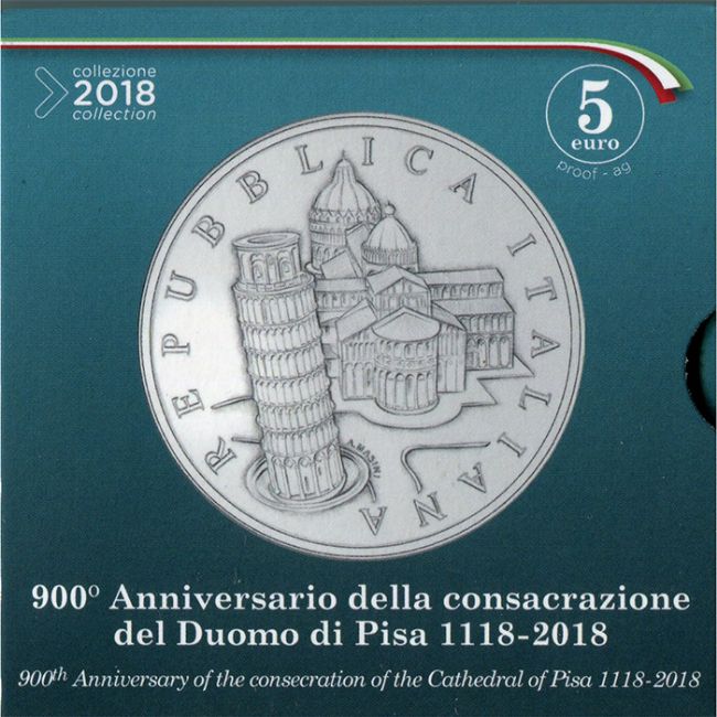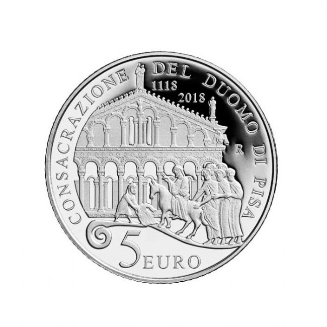 Celebrazione per il 900° anniversario della consacrazione del Duomo di Pisa 1118-2018, moneta da 5 euro in argento 925% versione fondo specchio (proof) emessa dalla zecca poligrafico dello Stato della Repubblica Italiana anno 2018.