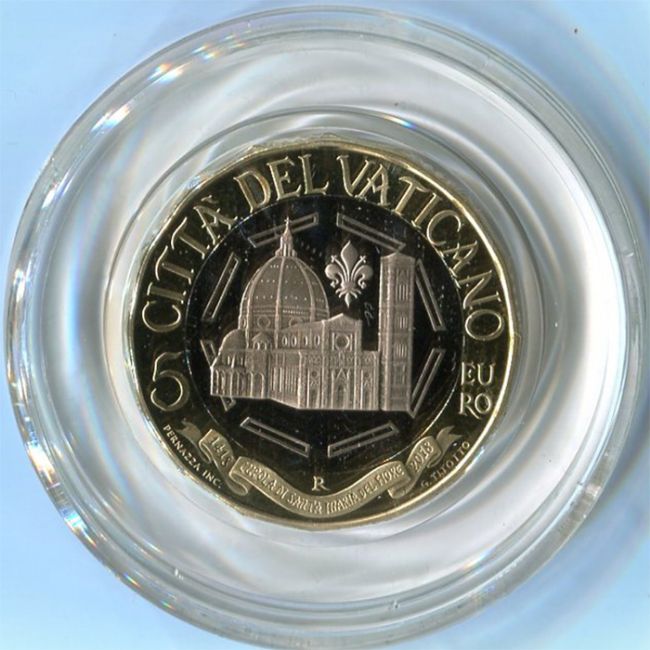 Pontificato di sua Santità Papa Francesco, emissione numismatica da parte del Governatorato della Città del Vaticano della moneta da 5 euro bimetallica in versione fondo specchio (proof) anno 2018. La Città del Vaticano celebra il VI Centenario della progettazione della cupola sovrastante Santa Maria del Fiore alla cattedrale di Firenze da parte di Filippo Brunelleschi, una delle imprese costruttive più significative del Rinascimento, realizzata tra il 1418 e il 1436. La moneta nella capsula è inserita nel suo astuccio originale. Moneta da 5 euro bimetallica, 27,50 mm, 9,5 grammi.