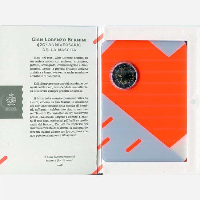 Moneta commemorativa da 2 euro della Repubblica di San Marino in versione fior di conio anno 2018 in occasione del 420° anniversario della nascita di Gian Lorenzo Bernini. Nato nel 1598 fu un artista poliedrico: scultore, architetto, pittore, scenografo,
