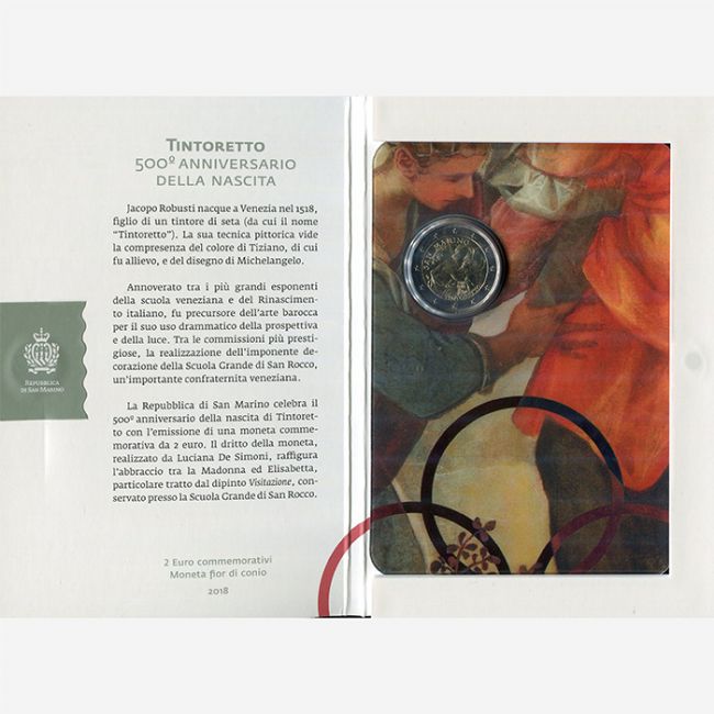 Repubblica di San Marino, moneta da 2 euro commemorativo in versione fior di conio anno 2018 emessa in occasione del 500° anniversario della nascita di Jacopo Robusti detto il Tintoretto che nacque a Venezia nel 1518, annoverato tra i più grandi esponenti della scuola veneziana e del Rinascimento Italiano.