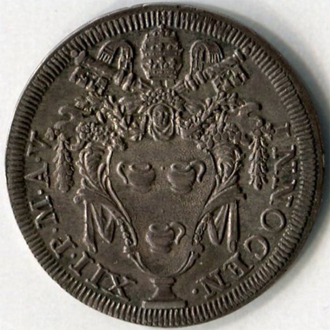 Stato Pontificio, Innocenzo XII (Antonio Pignatelli di Spinazzola) 1691-1700, Testone 1695 in argento. Al dritto della moneta stemma a vaso con piede sormontato da tiara con chiavi decussate e in alto testina e due anse a forma di cornucopia, al rovescio il Pontefice in trono tra due cardinali, davanti al Pontefice il pulpito e a destra due figure che suonano la tromba, sotto la data 1695e intorno la scritta ROGATE QVAE AD PACEM SVNT.