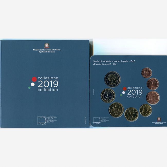 Repubblica Italiana, Ministero dell'Economia e delle Finanze Dipartimento del Tesoro, emissione numismatica per la collezione di monete euro a corso legale, serie di monete versione fior di conio (fdc) anno 2019, annual coin set, coniate dalla zecca poligrafico dello Stato Italiano. Il set di monete euro è composta da: 1-2-5-10-20-50 euro centesimi, 1-2 euro, tutte le monete sono riunite nella confezione originale della zecca.