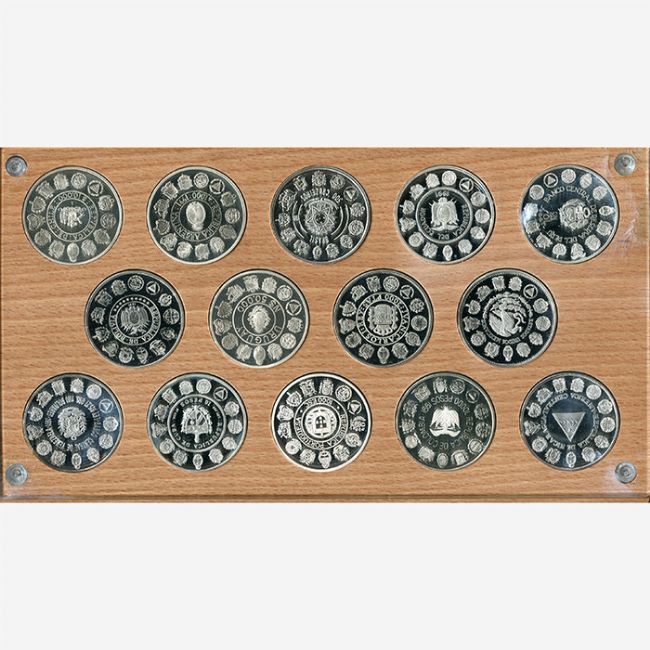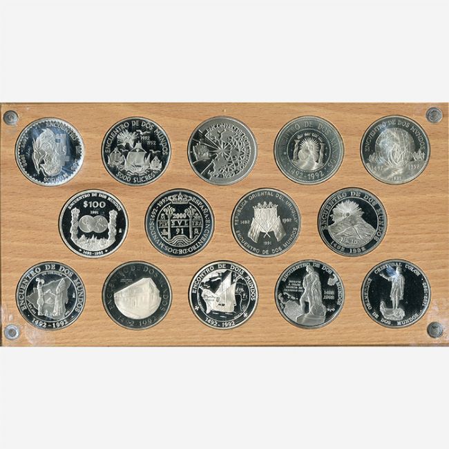 Per la prima volta al mondo 500 anni di storia danno vita a una moneta comune per 14 paesi: Argentina 1000 Australes, Bolivia 10 Bolivianos, Brasile 500 Cruzeiros, Colombia 10000 Pesos, Cuba 10 Pesos, Cile 10000 Pesos, Equador 5000 Sucres, Messico 100 Pesos, Nicaragua 1 Cordoba, Perù 1 Nuevo Sol, Portogallo 1000 Escudos, Spagna 2000 Pesetas, Uruguay 50000 Nacionales, Venezuela 1100 Bolivares. Le 14 monete Iberoamericane coniate sono in argento 925%. in versione fondo specchio (proof), ogni moneta pesa 27 grammi con un diametro di 40 mm. Ogni moneta inserita nella propria capsula, vengono raccolte in un elegante astuccio in legno.Nel 1492 la scoperta del Nuovo Mondo, 14 nazioni hanno dato vita ad una collezione coniando ognuna una moneta avente in comune il tema della celebrazione: incontro dei due Mondi 1492-1992.
