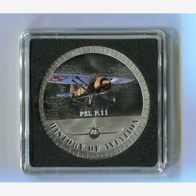 Moneta commemorativa in argento 999% emessa dalla Repubblica del Burundi da 5000 Franchi anno 2014, per commemorare la storia dell'Aviazione, History of Aviation, al dritto della moneta la raffigurazione dell'aereo: PZL P.11, al rovescio: testa di Leone frontale. Moneta da 5000 franchi,argento proof 999%,peso 20 gr.,diametro 38,6 mm.,tiratura: 1.931 pz. La moneta in capsula è inserita nella sua confezione originale.