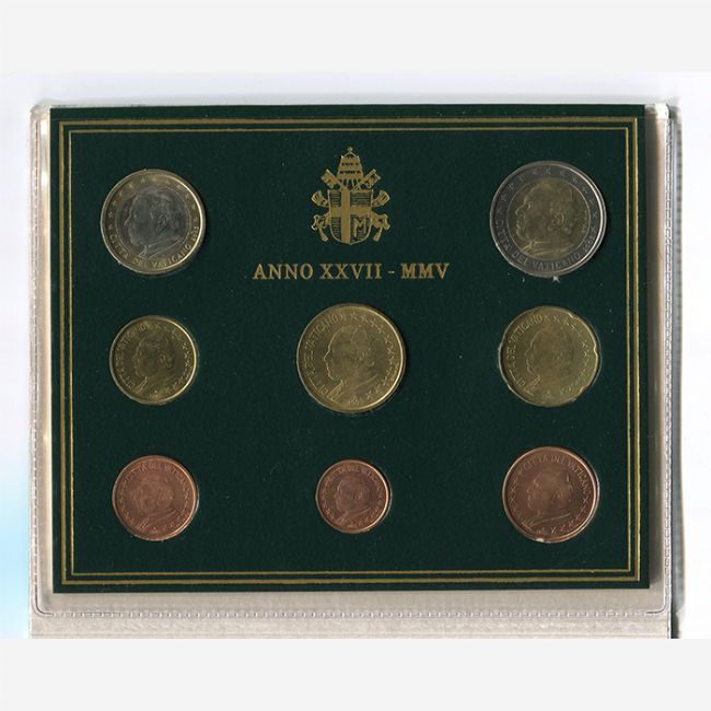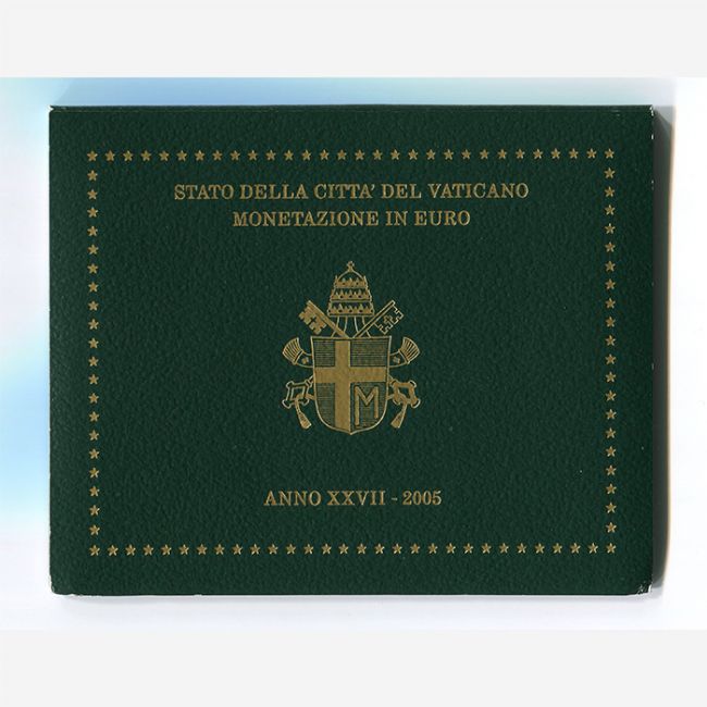 Monetazione Euro, Città del Vaticano, pontificato del Santo Padre Giovanni Paolo II, serie divisionale di monete euro in confezione zecca anno 2005 in versione fior di conio (fdc). La serie di 8 monete è composta dai valori: 1-2-5-10-20-50 centesimi di euro e 1-2 euro. Al dritto delle monete effigie di sua Santità Papa Giovanni Paolo II, al rovescio delle monete: carta dell'unione europea. Anno della morte del Santo Pontefice, ultima serie emessa di Giovanni paolo II.