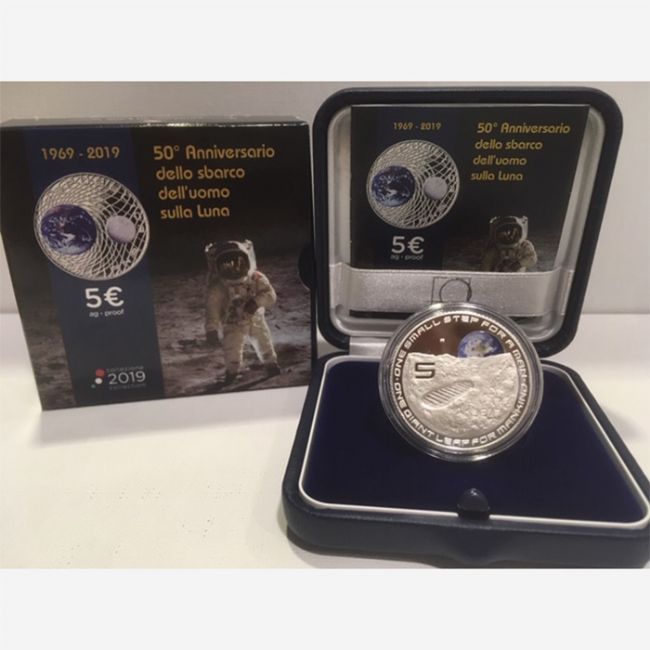 La Repubblica Italiana, tramite l'Istituto Poligrafico dello Stato, ha coniato una moneta da 5 Euro in argento 925% in versione Proof(fondo specchio), per celebrare e commemorare il 50° anniversario dello sbarco dell'uomo sulla Luna 1969-2019. Al dritto della moneta raffigurazione dell Terra e della Luna a colori e sullo sfondo la rete dello spazio-tempo, in alto e in basso le scritte REPUBBLICA ITALIANA. Al rovescio della moneta in primo piano è rappresentata l'impronta dell'astronauta Amstrong sul suolo lunare, dopo lo sbarco avvenuto il 20 luglio 1969 e la Terra a colori che sorge all'orizzonte, intorno alla raffigurazione la scritta ONE SMALL STEP FOR A MAN, ONE GIANT LEAP FOR MANKIND.