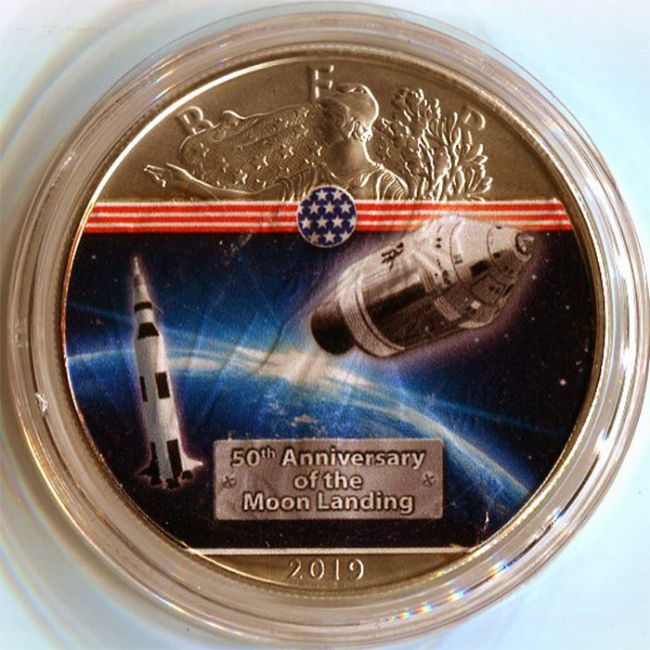 Stati Uniti d'America, moneta dollaro in argento 2019 per celebrare i 50 anni dell'allunaggio Apollo 11 e del primo Uomo sulla Luna. Dollaro American Eagle, Apollo 11, moneta in argento, Troy Ounce 999%. Tiratura 1969 monete. Il 20 luglio 1969 la missione spaziale Apollo 11 della NASA portò per la prima volta due uomini sulla Luna: Neil Armstrong e Buzz Aldrin. Proprio cinquanta anni fa si compiva quel viaggio, il più lungo mai intrapreso dall'uomo.