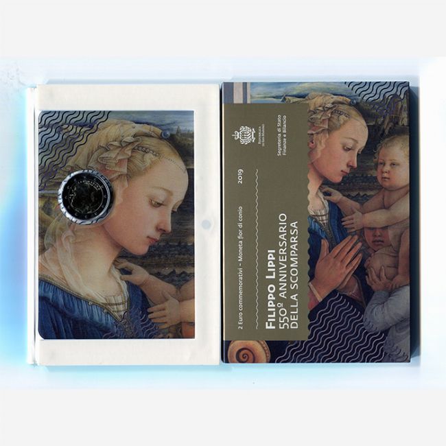 Repubblica di San Marino, moneta da 2 euro commemorativo in versione fior di conio anno 2019 emessa in occasione del 550° anniversario della scomparsa di Filippo Lippi. Il dritto della moneta raffigura la Vergine Maria intenta a contemplare Gesù che protende le braccia verso di lei, particolare tratto dal dipinto Madonna con il Bambino e due Angeli del 1460-1465, conservata presso la Galleria degli Uffizi a Firenze.
