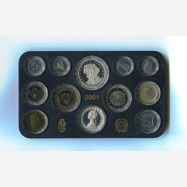 Repubblica Italiana,serie di monete in confezione zecca annata 2001 in versione fondo specchio (proof).La serie riunita nel cofanetto originale emesso dall'Istituto Poligrafico Zecca dello Stato è composta dalle monete Lire:1,2,5,10,20,50,100,200,500,1000 e 500 lire in Argento Caravelle 835% e 1000 lire moneta commemorativa in Argento 835% dedicata a Giuseppe Verdi.L'annata completa del 2001 è l'ultima serie di monete che la Repubblica Italiana ha emesso in Lira.