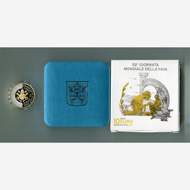 Città del Vaticano, pontificato di Papa Francesco, emissione della moneta da 10 euro in argento e oro, fondo specchio (proof) anno 2019,per celebrare il 52° Giornata della Pace. MISERANDO ATQUE ELIGENDO MMXIX. Al dritto della moneta la rappresentazione della Lavanda dei piedi,il gesto che Gesù ha compiuto durante l'Ultima Cena prima di essere condannato a morte e raccontato dal Vangelo di Giovanni.La lavanda dei piedi era una caratteristica dell'ospitalità nel mondo antico,era un dovere dello schiavo verso il padrone, della moglie verso il marito, del figlio verso il padre.Caratteristiche della moneta: valore nominale 10 euro - argento 925% - oro 999% - versione proof - tiratura 1.500 esemplari.