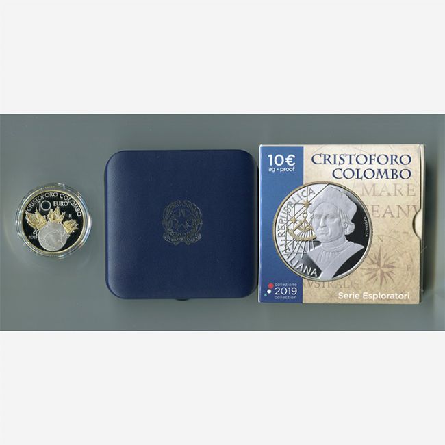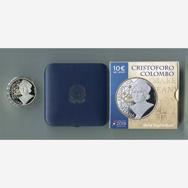 La Zecca Poligrafico dello Stato della Repubblica Italiana,per la tematica della serie degli esploratori celebra nel 2019 con l'emissione della moneta da 10 euro in argento in versione proof (fondo specchio) il grande esploratore Cristoforo Colombo.Al dritto della moneta il ritratto del grande esploratore con affianco lo strumento dorato utilizzato per misurare l'altezza angolare di un corpo celeste rispetto alla linea dell'orizzonte,al rovescio le tre Caravelle dorate in navigazione sopra al globo rappresentato al centro della moneta dove all'interno è rappresentato il percorso del primo viaggio di Colombo.Caratteristiche della moneta: Argento 925% - Proof - Tiratura 5000 PZ. - Bordo godronatura spessa discontinua -