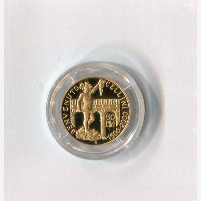 Repubblica Italiana, coniazione aurea della moneta da 50.000 Lire anno 2000, emessa per celebrare il 500° anniversario della nascita di Benvenuto Cellini, 1500-2000. Al dritto della moneta il profilo di Benvenuto Cellini, al rovescio in primo piano il Perseo, opera del Cellini e sullo sfondo la Loggia dei Lanzi. Moneta in oro 900% - versione fondo specchio (proof) - gr.7,5 - 20 mm -