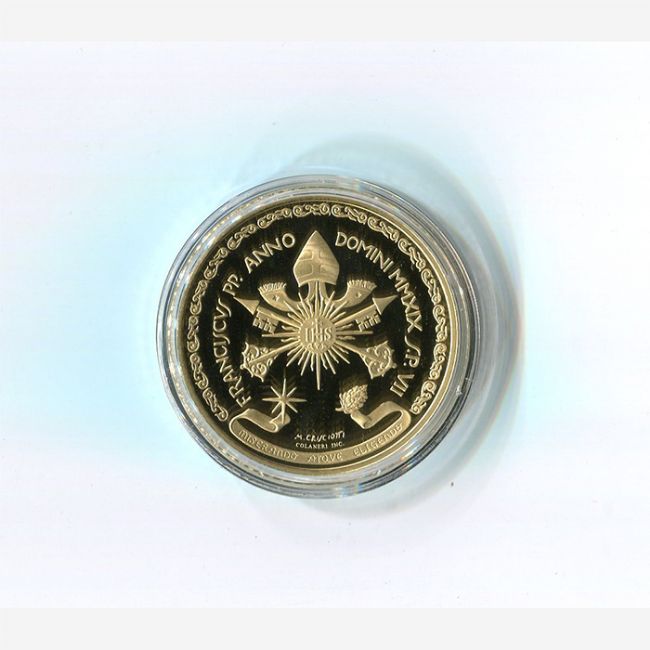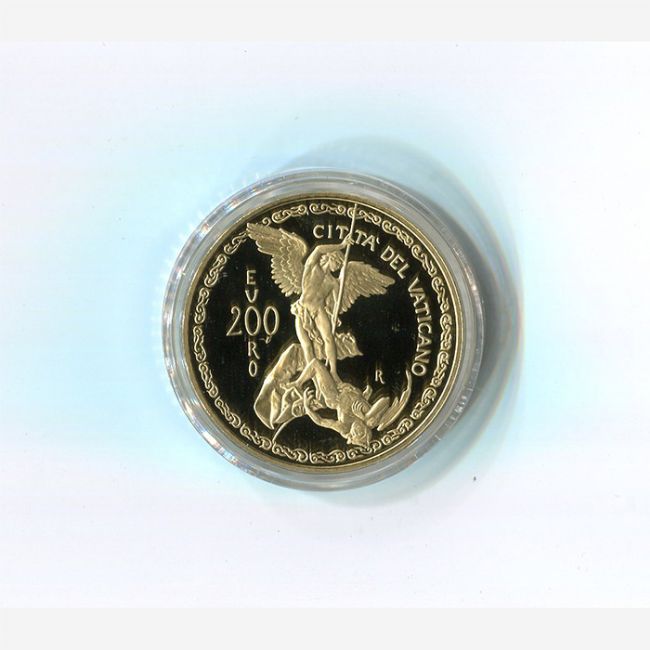 Città del Vaticano, pontificato di Papa Francesco, emissione della moneta in oro da 200 euro "L'Arcangelo Michele" anno 2019, moneta aurea coniata per inaugurare un ciclo triennale dedicato agli Angeli Michele, Gabriele e Raffaele. Il Santo Padre raccomanda di pregare ed affidarsi agli arcangeli affinchè ci aiutino nella lotta contro le seduzioni del diavolo. Al dritto della moneta rappresentazione dell'Angelo Michele che schiaccia Satana, al rovescio stemma di Papa Francesco. Caratteristiche della moneta: moneta in oro 917/1000 - gr. 40 - 35 mm - tiratura 499 pz. -