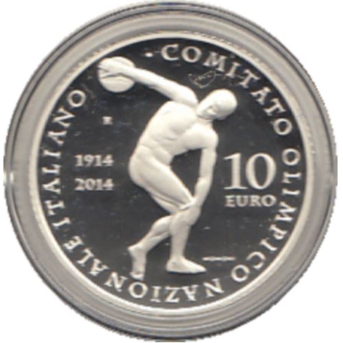 Moneta in Argento fondo specchio da 10 Euro emessa dalla zecca poligrafico dello stato nel 2014, nel dritto della moneta è raffigurata la Vittoria Olimpica scultura di Emilio Greco, nel rovescio della moneta il Discobolo di Mirone. Moneta venduta nel suo atuccio Argento .925 proof. 34 mm