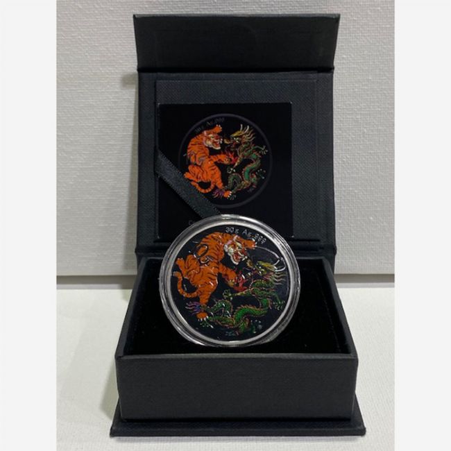 Moneta commemorative Cinese in argento 999/1000 da 10 Yuan, Panda Tiger Dragon, Colourised Black Ruthenium, anno 2019. Moneta in argento 999/1000 - 30 gr. - 40 mm - Black Ruthenium - Edizione Limitata 100 PZ -