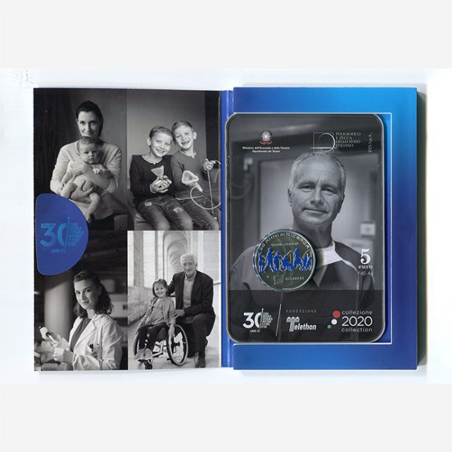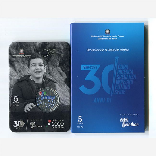 Il Poligrafico e Zecca dello Stato della Repubblica Italiana, con la coniazione della moneta da 5 euro in argento versione fior di conio con elementi colorati, celebra il 30° anniversario di Fondazione Telethon (1990-2020), e i suoi 30 anni di ricerca per arrivare alla cura delle malattie genetiche rare. Al dritto della moneta il logo della fondazione Telethon e la raffigurazione di una composizione che rappresenta la ricerca e l'elica del DNA. Al rovescio della moneta sagome sovrapposte di figure umane unite in segno di solidarietà e sullo sfondo la doppia elica del DNA stilizzata.