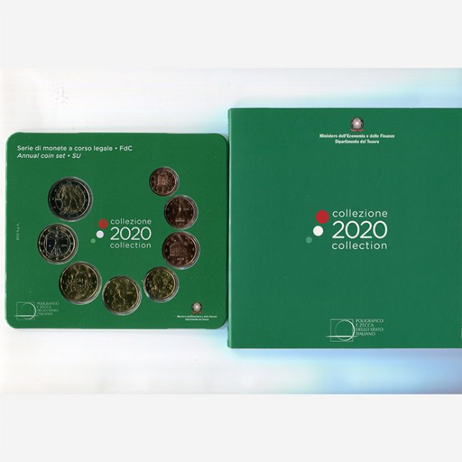 Repubblica Italiana, Ministero dell'Economia e delle Finanze Dipartimento del Tesoro, emissione numismatica per la collezione di monete euro a corso legale, serie di monete versione fior di conio (fdc) anno 2020, annual coin set, coniate dalla zecca poligrafico dello Stato Italiano. Il set di monete euro è composta da: 1-2-5-10-20-50 euro centesimi, 1-2 euro, tutte le monete sono riunite nella confezione originale della zecca.