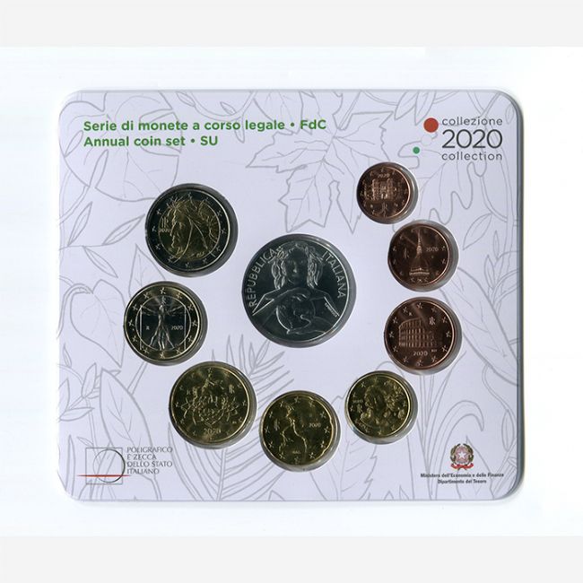 Repubblica Italiana, Ministero dell'Economia e delle Finanze Dipartimento del Tesoro, emissione numismatica per la collezione di monete euro a corso legale, annual coin set, coniate dalla zecca poligrafico dello Stato Italiano. Serie di monete euro versione fior di conio (fdc) anno 2020 con moneta commemorativa in argento da 5 euro, per celebrare l'anno internazionale della salute delle Piante. Il set di monete euro è composta da: 1-2-5-10-20-50 euro centesimi, 1-2 euro e 5 euro in argento 925%, tutte le monete sono riunite nella confezione originale della zecca.