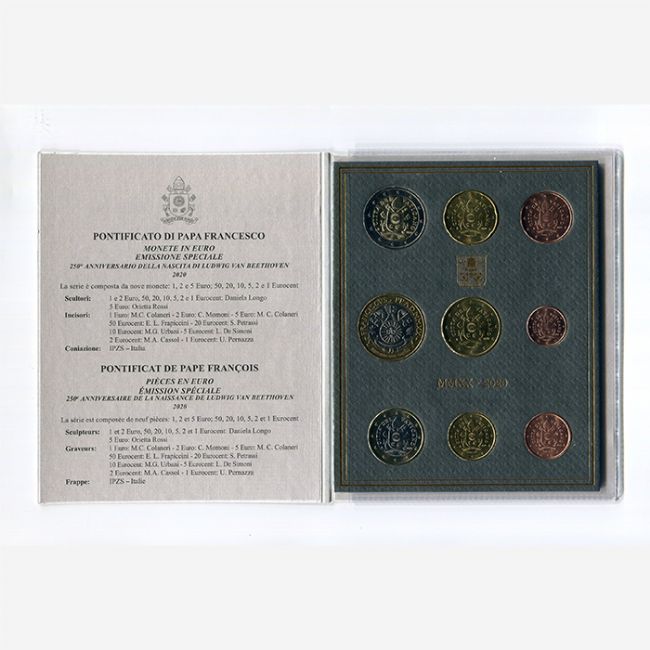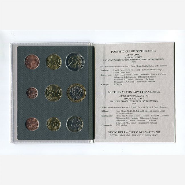 Città del Vaticano, pontificato di Papa Francesco, emissione speciale - 250° anniversario della nascita di Ludwig Van Beethoven - serie di monete in euro versione fior di conio con moneta bimetallica da 5 euro, anno 2020. La serie è composta da 9 monete: 5 euro commemorativa, 2 e 1 euro, 50,20,10,5,2,1 Eurocent. Il Vaticano celebra il geniale compositore e pianista tedesco, in occasione del 250° anniversario della nascita con l'emissione della moneta bimetallica da 5 euro. La raffigurazione del volto del musicista è ispirata al ritratto di Ludwig van Beethoven eseguito da Joseph Karl Stieler nel 1820.