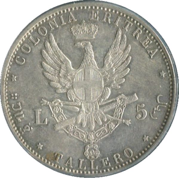 Moneta Tallero in argento da 5 lire di Umberto I del 1891, Colonia Eritrea, zecca di Roma, nel dritto della moneta semibusto coronato in uniforme e intorno la scritta UMBERTO I RE D'ITALIA 1891, al rovescio della moneta aquila coronata con ali spiegate e con scudo sabaudo in petto l.5 tra gli artiglli lo scettro e il bastone da cui pende il collare dell'annunziata. In questo possedimento italiano si stabilì di coniare una moneta simile nel peso e nel diametro al Tallero Etiopico con il quale mediante la convezione tra l'Italia e l'Etiopia del 1 ootbre 1889, fosse possibile l'intercircolazione in entrambi i territori.