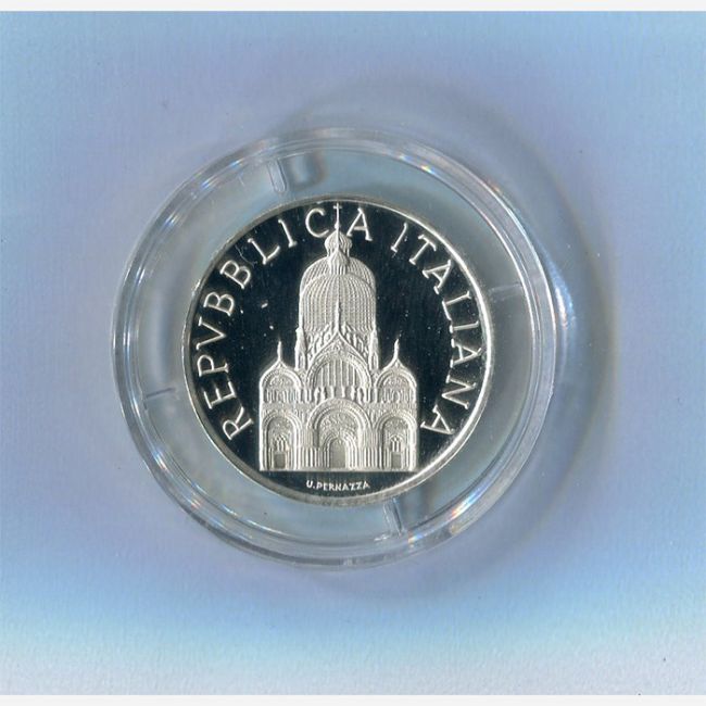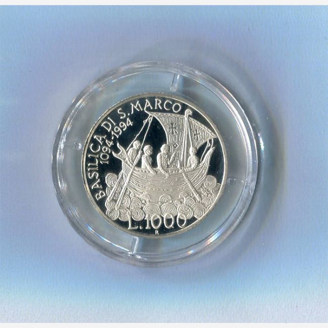 Moneta celebrativa da 1000 Lire in argento versione fondo specchio (Proof) emessa dalla Repubblica Italiana nel 1994 a celebrare l'Anno Marciano in Venezia. Al dritto della moneta il prospetto della Basilica di San Marco, al rovescio la raffigurazione ripresa dalla Pala d'oro della traslazione del corpo di San Marco a Venezia. Moneta in argento 835/1000 in versione pfoof. - 14,6 GR. - 31,4 MM - Moneta in astuccio originale -