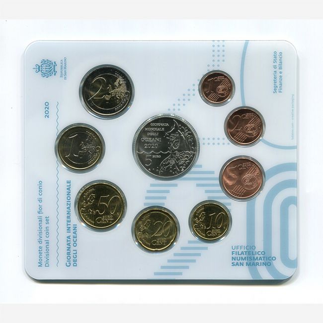 Serie completa di monete euro in confezione zecca della Repubblica di San Marino, serie divisionale monete in euro in versione fior di conio anno 2020, per celebrare la Giornata Mondiale degli Oceani. All'interno della serie di monete è inserita la monete da 5 euro in argento 925/1000 dove al rovescio mostra un delfino che si tuffa in acqua, la raffigurazione svela l'impatto devastante dell'uomo che con i suoi rifiuti inquina le acque dei mari e avvelena le creature che vi abitano. Al dritto della moneta sono raffigurate le acque che con le loro onde lambiscono le Tre Torri e richiamano le volute delle Penne, a simboleggiare l'essenzialità dell'elemento acqua per l'ecosistema e gli esseri umani.