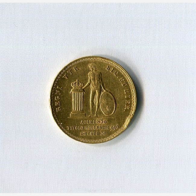 Monete degli Antichi Stati Italiani, Regno delle Due Sicilie, Francesco I di Borbone (1825-1830) moneta da 30 ducati in oro. Al dritto della moneta testa a destra e intorno la scritta FRANCISCVS I DEI GRATIA REX e sotto la data 1826, al rovescio Genio nudo, la mano destra su colonna coronata, tiene con la mano sinistra lo scudo, attorno REGNI VTR SIC ET HIER, in esergo ACINI 850 titolo millesimi 996 ducati 30, il contorno reca in incuso giglio e PROVIDENTIA OPTIMI PRINCIPIS. Figlio di Ferdinando I e di Maria Carolina d'Austria, nacque a Napoli nel 1777, il suo regno fu breve durata perchè morì nel 1830, lasciando il trono al figlio Ferdinando II.