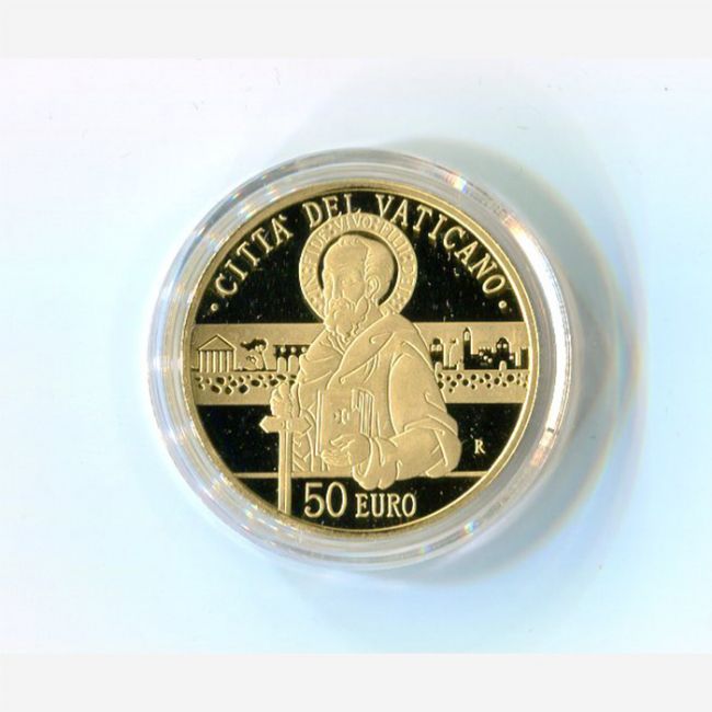 Monetazione aurea della Città del Vaticano, anno VIII del pontificato di Papa Francesco, emissione della moneta da 50 euro in oro anno 2020, tematica Atti degli Apostoli: Paolo il testimone di Cristo. Al dritto della moneta la raffigurazione di San Paolo ritratto con in mano il libro la Parola di Dio e con la spada a due tagli che permette all'uomo di riconoscere il bene e il male, sullo sfondo della moneta si intravedono in linea simbolica le città di Roma e Gerusalemme dove il Santo a svolto maggiormente il suo Apostolato. Moneta in confezione zecca, oro 917/1000, gr. 15, versione fondo specchio (proof).