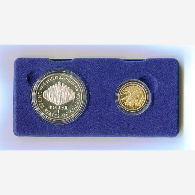 Monete mondiali, Stati Uniti d'America, dittico di monete in confezione zecca emesse nel 1987 in Oro e in Argento a celebrare il 200° anniversario della Costituzione Americana (1787-1987). La confezione è composta dalla moneta da 5 dollari in oro 900/1000 Gr. 8,359 e dalla moneta da 1 dollaro in argento 900/1000 Gr. 26,730. Le due monete sono in versione fondo specchio (proof).