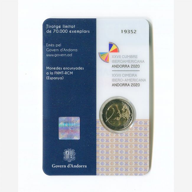 Monetazione euro, emissione ufficiale della moneta commemorativa da 2 euro Andorra 2020 emessa per celebrare il XXVII Summit Cimera Ibero Americana in folder, in versione fior di conio (fdc). Al dritto della moneta albero formato da sagome umane e ruote dentate, al rovescio carta dell'Unione Europea allargata.