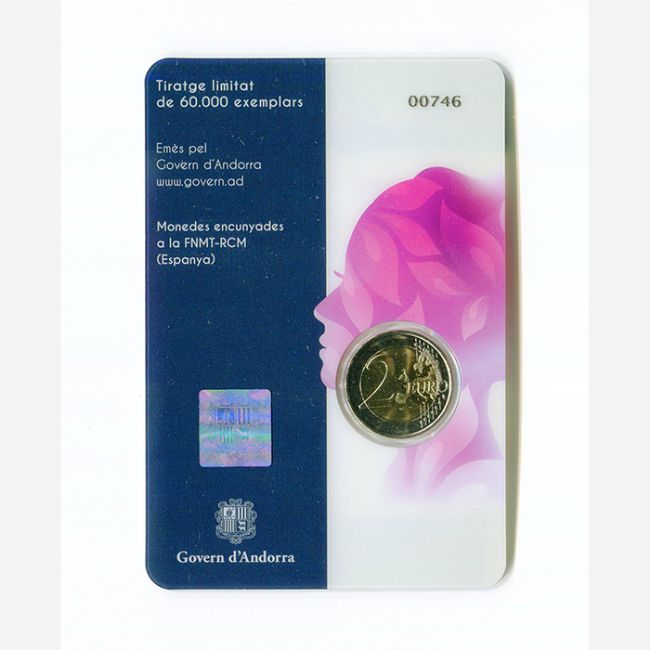 Monetazione euro, emissione ufficiale della moneta commemorativa da 2 euro Andorra 2020, emessa per celebrare il 50° del Suffragio Universale Femminile in folder, in versione fior di conio (fdc). Al dritto della moneta volto di donna e nomi femminili a formare i capelli, scritta commemorativa anni 1970 e 2020, al rovescio carta dell'Unione Europea allargata, fondo linee trasversali delineate ciascuna da due stelle.