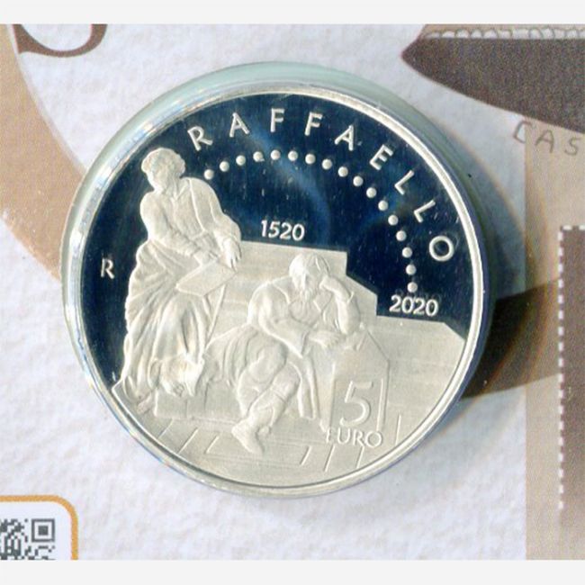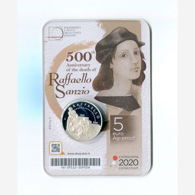 Monete Italia Euro, Repubblica Italiana anno 2020, moneta commemorativa da 5 euro in argento 925/1000 coniata per celebrare il 500° anniversario della morte di Raffaello Sanzio (1483 Urbino - 1520 Roma). La moneta in confezione blister è in versione fondo specchio (proof) e raffigura al dritto l'autoritratto di Raffaele Sanzio, particolare del dipinto del 1506 (Galleria degli Uffizi, Firenze) al rovescio il particolare dell'affresco Scuola di Atene realizzato dal Raffaello tra il 1509 e il 1511 (Musei Vaticani, Città del Vaticano). Peso 18 Gr - argento 925/1000 - versione proof - valore nominale 5 euro - anno 2020 -
