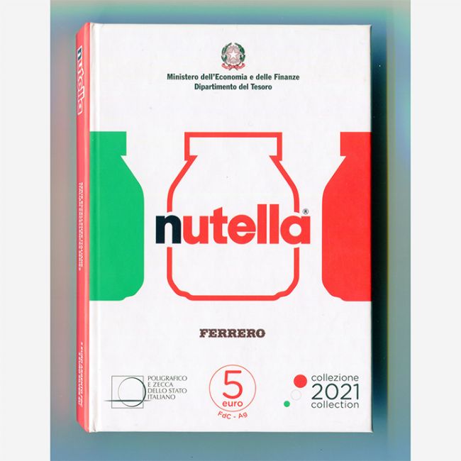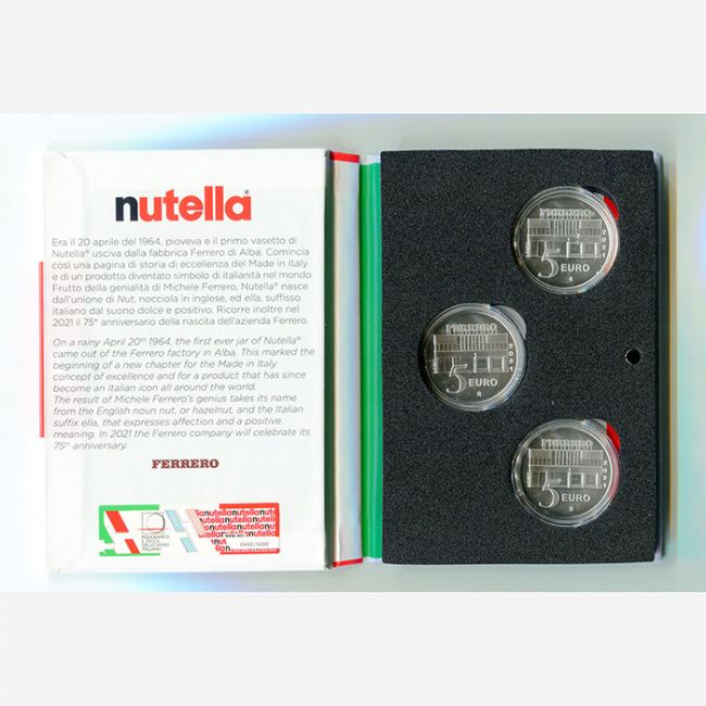 Monetazione euro, Repubblica Italiana, trittico di monete commemorative da 5 euro in argento, anno 2021, tematica dedicata alla serie di eccellenze Italiane per celebrare la la crema alle nocciole da spalmare più famosa al mondo, la Nutella. Le tre monete sono con elementi colorati, al dritto delle monete il tradizionale vasetto di Nutella, intorno la scritta REPUBBLICA ITALIANA. Al rovescio la riproduzione dello stabilimento italiano del Gruppo Ferrero, azienda specializzata dagli anni quaranta, anni in cui fu fondata, in prodotti dolciari. Moneta in argento 925/1000 - valore nominale 5 euro - 32 MM - 54 GR. - Fior di Conio (FDC) - Monete in confezione Astuccio -