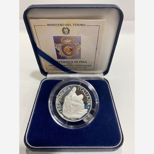 Repubblica Italiana, moneta da 500 lire in argento versione fondo specchio anno 1993 coniata per celebrare il 650° anniversario della fondazione dell'Università di Pisa. La moneta al dritto: figura femminile simboleggiante l'Italia, al rovescio: Architetture di Pisa con lo stemma della Città su un cartiglio. Moneta in argento 835/1000 - versione FS - Gr. 15 - MM. 32 -
