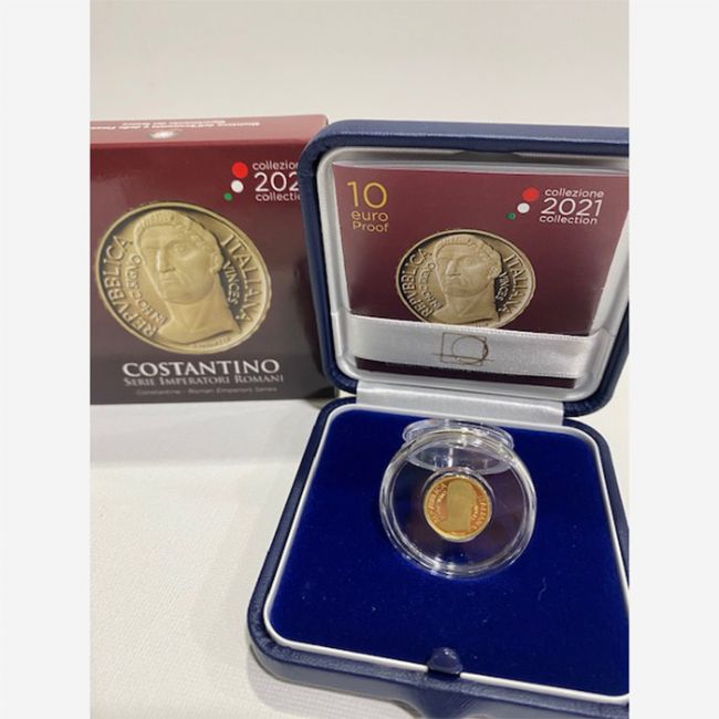 Repubblica Italiana, monetazione in euro, anno 2021, moneta da 10 euro in oro 900/1000 in versione fondo specchio emessa per celebrare e commemorare COSTANTINO nell'ambito della serie Imperatori Romani - COSTANTINE Roman Emperors Series -. Al dritto della moneta testa di Costantino presa dalla statua colossale in marmo proveniente dall'abside della Basilica di Massenzio di Roma, al rovescio al centro della moneta particolare dell'arco di Costantino di Roma dedicato all'imperatore romano contro Massenzio nella battaglia di Ponte Milvio raffigurante la Vittoria Alata. Caratteristiche della moneta: valore nominale 10 euro - Oro 900/1000 - Gr. 3 - diametro 13,85 mm - Proof - tiratura 1200 pz. -