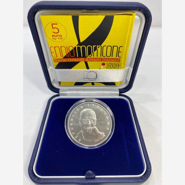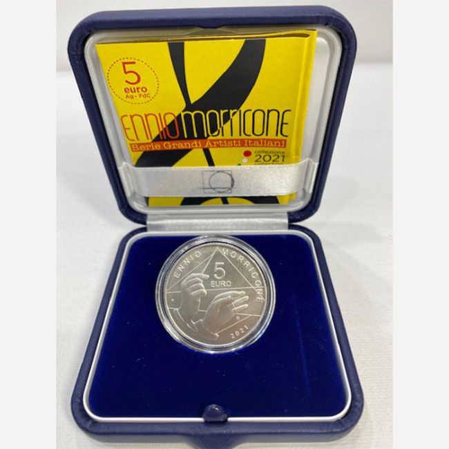 Monetazione euro, Repubblica Italiana, per la serie grandi artisti Italiani emissione della moneta celebrativa da 5 euro in argento a celebrare Ennio Morricone, anno 2021, in versione fior di conio (FDC). Al dritto della moneta: ritratto del compositore e direttore d'orchestra italiano Ennio Morricone, al retro: raffigurazione delle mani del Maestro nell'atto di dirigere. Moneta in argento firo di conio - Titolo 925/1000 - Gr. 18. - Diametro 32 MM. -