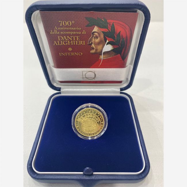 Monetazione euro, Repubblica Italiana, collezione 2021, moneta celebrativa da 20 euro in oro versione fondo specchio per il 700° Anniversario della scomparsa di Dante Alighieri, Inferno. Al dritto della moneta il profilo di Dante Alighieri, particolare ispirato da un'opera di Sandro Botticelli, al rovescio della moneta rappresentazione stilizzata dell'inferno dantesco con i novi gironi descritti nella Divina Commedia dove sono raffigurati le ali del diavolo, il fuoco e il ghiaccio. Specifiche tecniche: 20 euro in oro 900/1000 - GR. 6,54 - MM. 21 - Proof -
