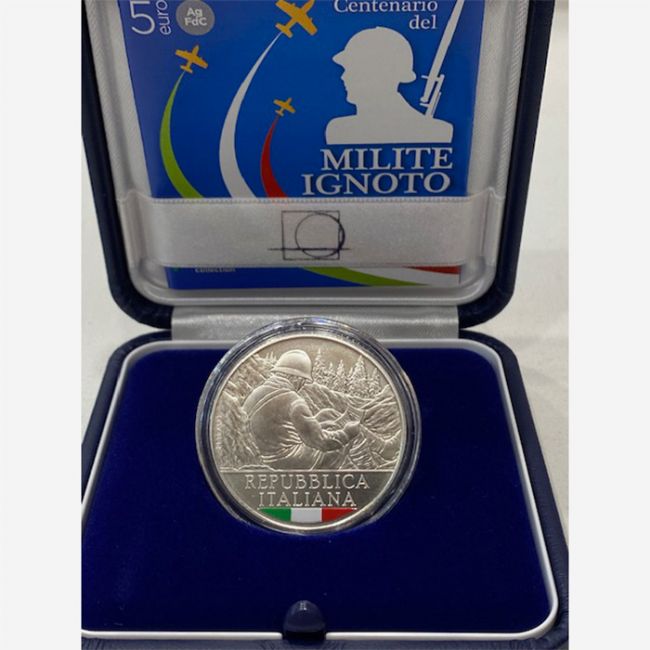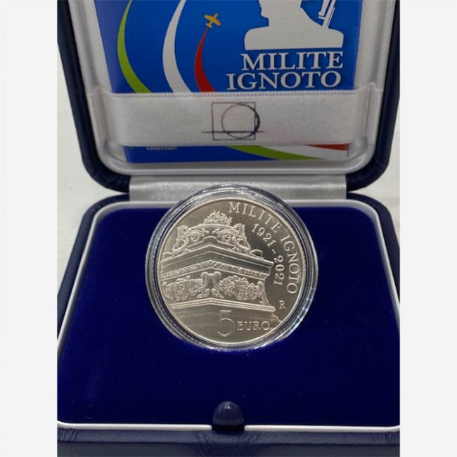 Monetazione euro, moneta in argento 925/1000 da 5 euro versione fondo specchio (FS) coniata dalla zecca poligrafico dello Stato della Repubblica Italiana a celebrare il centenario del Milite Ignoto 1921-2021. La moneta nel dritto raffigura un soldato al fronte che legge una lettera, sotto la scritta REPUBBLICA ITALIANA, in basso il tricolore smaltato, al rovescio della moneta raffigurazione di uno dei due bracieri posti ai lati del sacello del Milite Ignoto che custodisce, all'interno dell'Altare della Patria, un soldato italiano caduto nella Prima Guerra Mondiale a ricordo e commemorazione di coloro che hanno donato la vita in nome dell'Italia e della sua libertà. Nel giro a destra della moneta la scritta MILITE IGNOTO e le date 1921 - 2021. Moneta da 5 euro con elementi colorati - GR. 18 - Argento 925/1000 - MM. 32 - Versione FS -