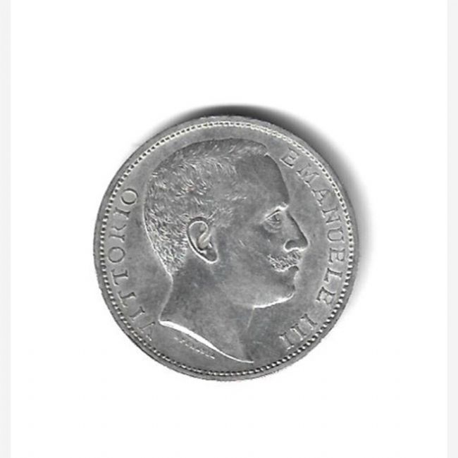 Monete del Regno d'Italia, Vittorio Emanuele III, 2 lire in argento del 1904, zecca Roma. Al dritto della moneta testa del Re e sotto il collo il nome dell'incisore Speranza, al rovescio Aquila araldica spiegata e coronata con lo scudo sabaudo nel petto, circolarmente fra due nodi la leggenda REGNO D'ITALIA, nel basso il segno di zecca tra due stellette, al contorno della moneta reca in incuso tre FERT tra nodi e rosette. Moneta in argento 835/1000.