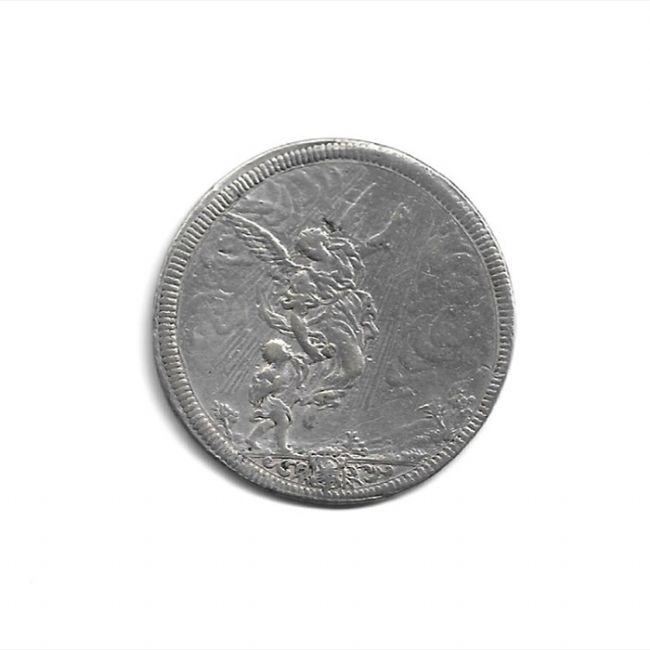 Antichi Stati Italiani, monetazione dello Stato Pontificio, pontificato di Clemente XI (Gianfrancesco Albani 1700-17219, mezza piastra in argento, anno VII. Al dritto della moneta lo stemma sormontato da triregno e chiavi decussate con cordoni e fiocchi, intorno allo stemma CLEMENS.XI.P.M.ANN.VII, al retro la raffigurazione di Tobia e l'Angelo.