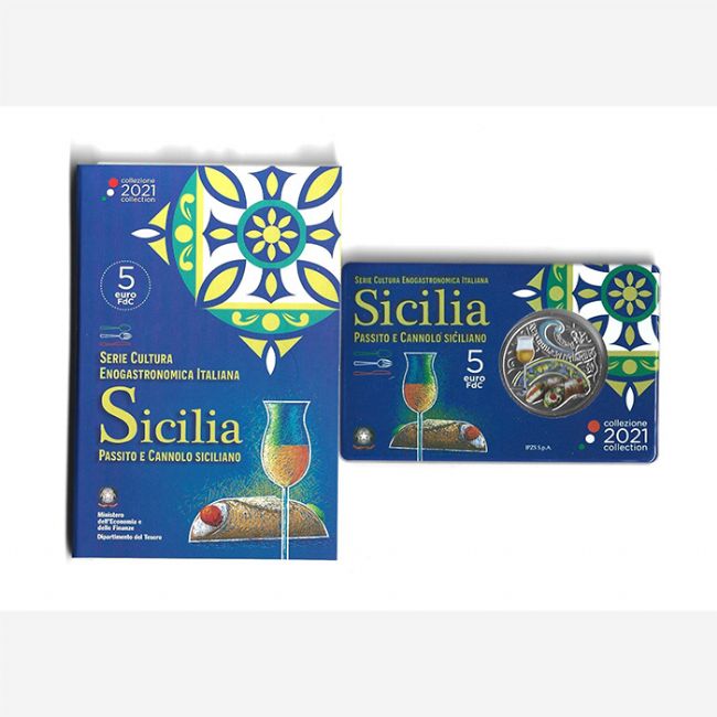Monetazione euro, Repubblica Italiana, serie cultura Italiana, moneta da 5 euro in Cupronichel in confezione coin card. Al dritto della moneta la raffigurazione di due cannoli siciliani e un bicchiere di Passito in primo piano su una decorazione tipica della ceramica di Caltagirone, al retro simboli della Sicilia come il Tempio della Concordia della Valle dei Templi, il teatro di Taormina, e la Trinacria.