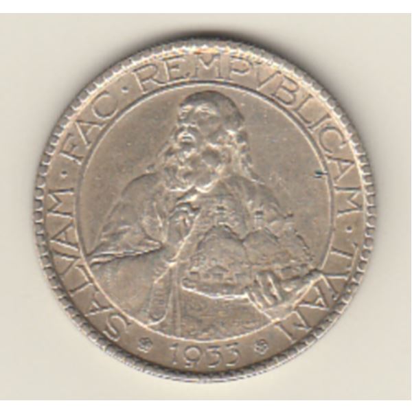 Moneta da 20 lire in argento emessa nel 1933 dalla Repubblica di San Marino. Nel dritto della moneta tre penne sovrastate da corona, nel rovescio busto di San Marino che sorregge le tre torri della Repubblica. Contorno rigato peso 15 g. La Repubblica di San Marino è il più antico ed uno dei più piccoli Stati d'Europa (14 secolidi vita), tutto compreso nel territorio Italiano, da un documento dell'885 risulta che in quell'anno era già uno Stato indipendente.