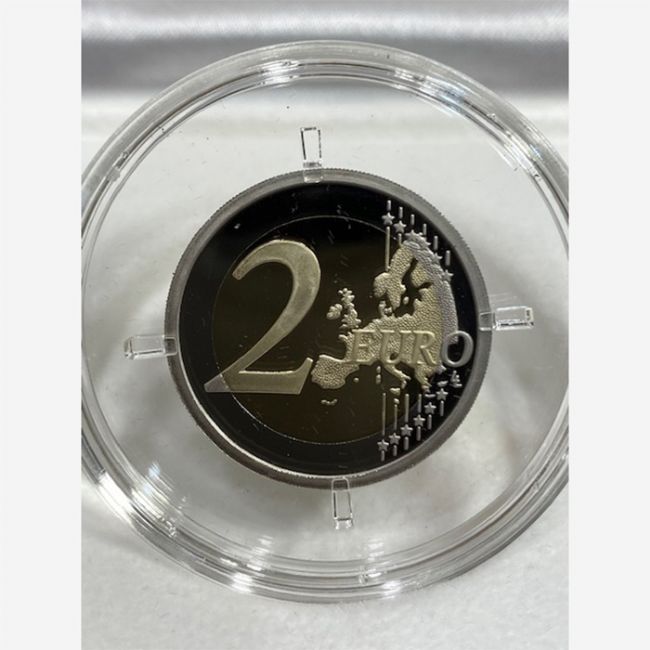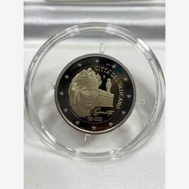 Moneta commemorativa dello Stato della Città del Vaticano, pontificato di Papa Francesco, moneta da 2 euro bimetallico anno 2021 in versione fondo specchio (PROOF) a celebrare il VII centenario della morte di Dante Alighieri. Al dritto della moneta il volto di Dante accanto ad uno dei monumenti di Firenze più conosciuti al mondo: Palazzo Vecchio.