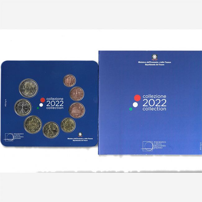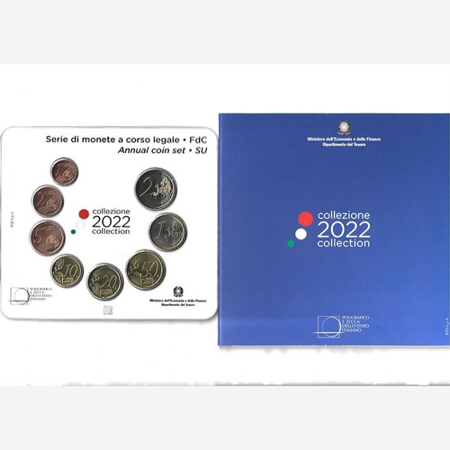 Repubblica Italiana, Ministero dell'Economia e delle Finanze Dipartimento del Tesoro, emissione numismatica per la collezione di monete euro a corso legale, serie di monete versione fior di conio (fdc) anno 2022, annual coin set, coniate dalla zecca poligrafico dello Stato Italiano. Il set di monete euro è composta da: 1-2-5-10-20-50 euro centesimi, 1-2 euro, tutte le monete sono riunite nella confezione originale della zecca.
